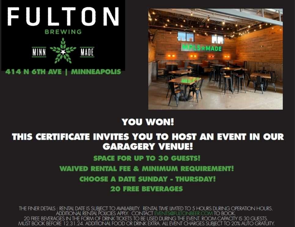 You and all your friends can have your event at Fulton Brewery! Use of private space for up to 30 people, with 20 drink tickets, and no beverage minimum included! Rental date subject to availability. Rental time limited to 5 hours during operation hours. Must book before 12.31.24. Additional food or drink extra. All event charges subject to 20% auto gratuity.